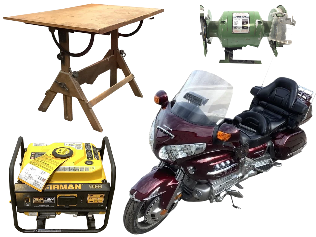 Hand & power tools, stationary equipment, woodworking equipment, paint sprayer, select wood carving tools, tool boxes, grinders, polishers,